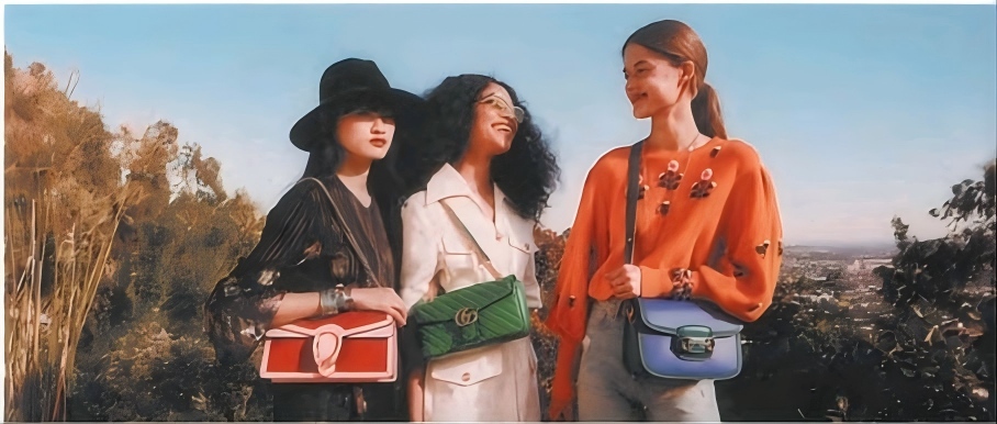 Close - up of three women's outfits and Gucci handbags with GG logo